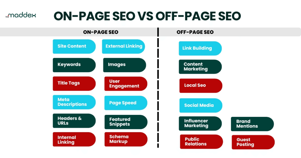 On-page SEO is about what happens within your website, like keyword optimization, internal linking, meta tags, and fast load times. These tactics help search engines crawl your site and match content to user intent.